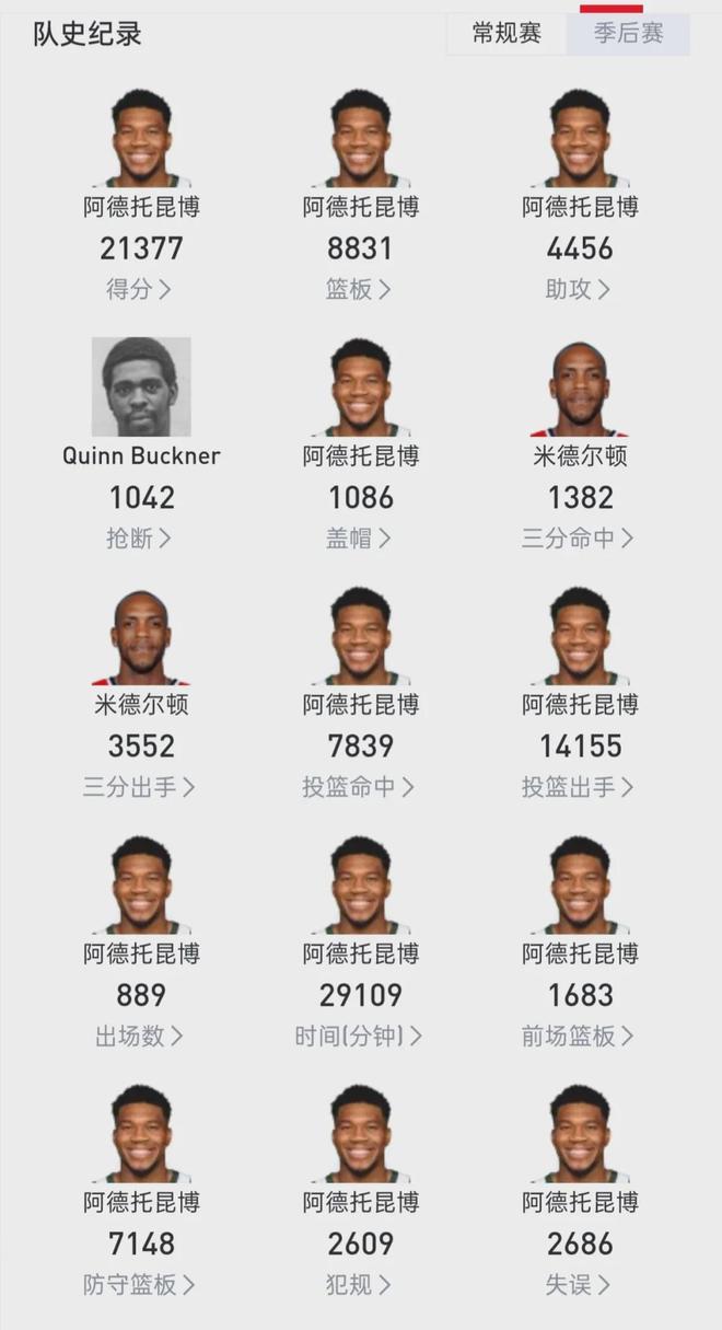 整個雄鹿生涯,字母哥打了889場常規賽,場均得到24分9.9籃板5助攻1.1搶斷1.2蓋帽3失誤,三項命中率:55.4%,28.6%,69.2%。字母哥的總出場數、得分、籃板、助攻、蓋帽、投籃出手和命中數等數據,均是雄鹿隊史第一。