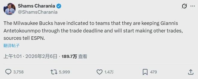北京時間2月6日凌晨1點,據NBA名記Shams報道,雄鹿正式通知聯盟各支球隊,不會在交易截止日(今天凌晨4點)送走字母哥。另一記者Jake Fischer報道,一位與雄鹿談判過的球隊高管表示,雄鹿從來沒有認真討論過字母哥的交易。
