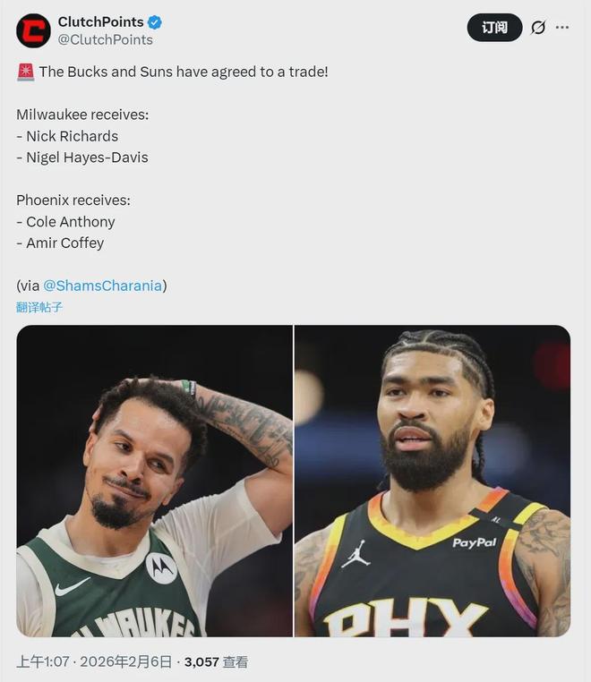 與此同時,雄鹿剛剛達成一筆2換2的交易:將科爾-安東尼和科菲送去太陽,換來尼克-理查茲和奈杰爾-海斯。目前雄鹿20勝29負排名東部第12,落后第10的公牛3個勝場。理查茲本賽季場均3.2分3.3籃板;奈杰爾-海斯場均1.3分1.2籃板。