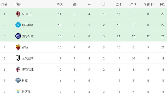 在積分榜上,AC米蘭登上了榜首位置。AC米蘭總積分達(dá)到22分,和那不勒斯積分相同,但在凈勝球一樣的情況下進(jìn)球數(shù)占優(yōu),得以排名第1。不過(guò),AC米蘭比那不勒斯多賽一場(chǎng),分分鐘有可能被擠下去。國(guó)際米蘭以21分排名第3。羅馬也是21分,排名第4。尤文圖斯19分,排名第5。博洛尼亞和科莫都是18分,排名第6和第7名。