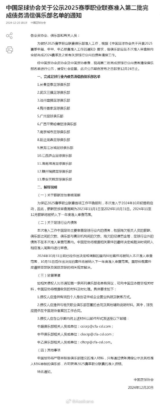 中國(guó)足協(xié)公示2025賽季職業(yè)聯(lián)賽準(zhǔn)入第二批完成債務(wù)清償俱樂部名單,此前不在第一批名單里的長(zhǎng)春亞泰、武漢三鎮(zhèn)、滄州雄獅、梅州客家、廣州、廣西平果哈嘹、南京城市、延邊龍鼎、黑龍江冰城、江西廬山、湖南湘濤、贛州瑞獅、泰安天貺全員上榜,相當(dāng)于所有三級(jí)職業(yè)俱樂部都進(jìn)行了完成債務(wù)清償?shù)墓尽????