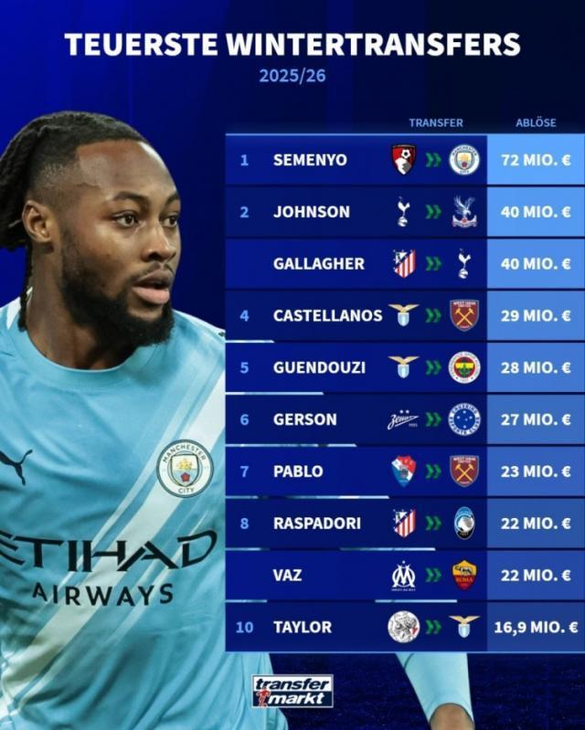 2025-26賽季冬季轉會窗已經開啟大約半個月時間,德國轉會市場盤點了球員的轉會費情況,塞梅尼奧7200萬歐最高,布倫南·約翰遜和加拉格爾均4000萬歐并列次席。以下為2025-26賽季冬窗球員轉會費排行: