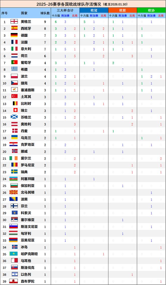 最后,看看各國聯賽在三大杯上征戰球隊的存活情況。